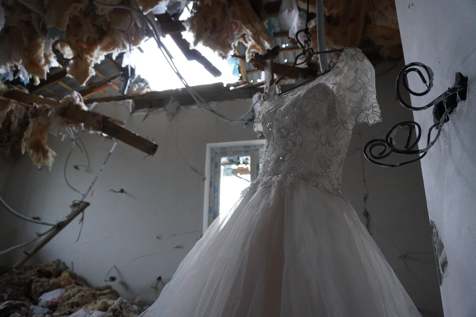 Once we walked inside the door leading into her home, which looked like a bomb had been set off inside, we found her wedding dress, eerily laying on the floor beneath a wire with a clothes hanger. She said when she first arrived back and entered her home after it had been destroyed, she saw her wedding dress hung up from a wire; the Russians who stayed there dragged it from her guest home on the other side of her backyard to use it for some sort of sick fantasy.